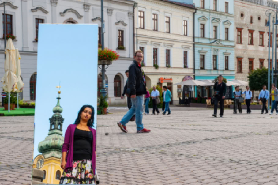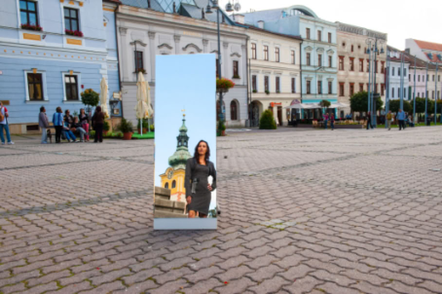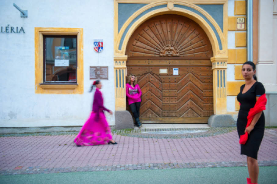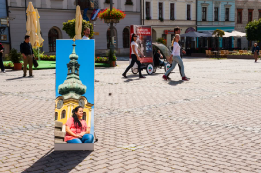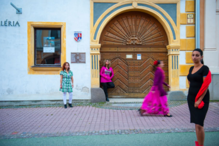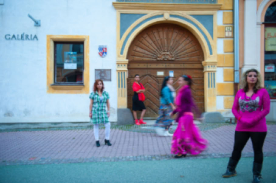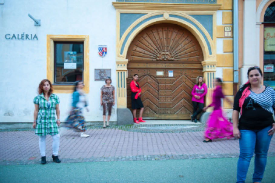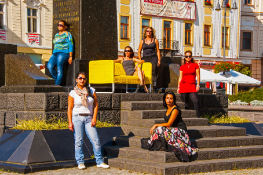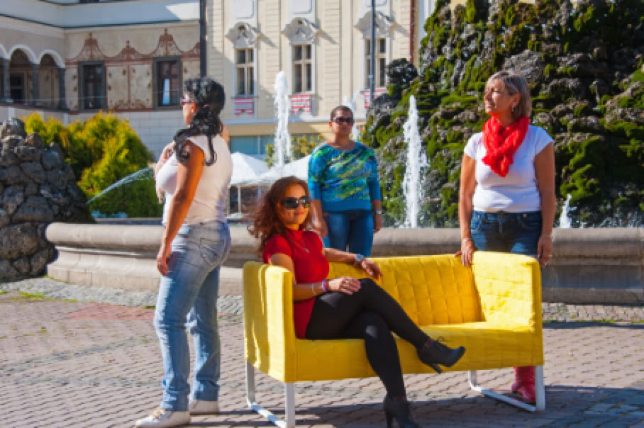 • Sitzplatz. Wer sitzt, nimmt auch in Besitz. Ein auf dem Hauptplatz von Banska Bystrica placiertes leuchtend gelbes Sofa, das den Romnija als Requisit für die Bilder dient, steht für die Inbesitznahme des Raumes, der allen zustehen soll. In diesem Fall der öffentliche Raum den Romafrauen. Also genau das, was ihnen oft verweigert wird.